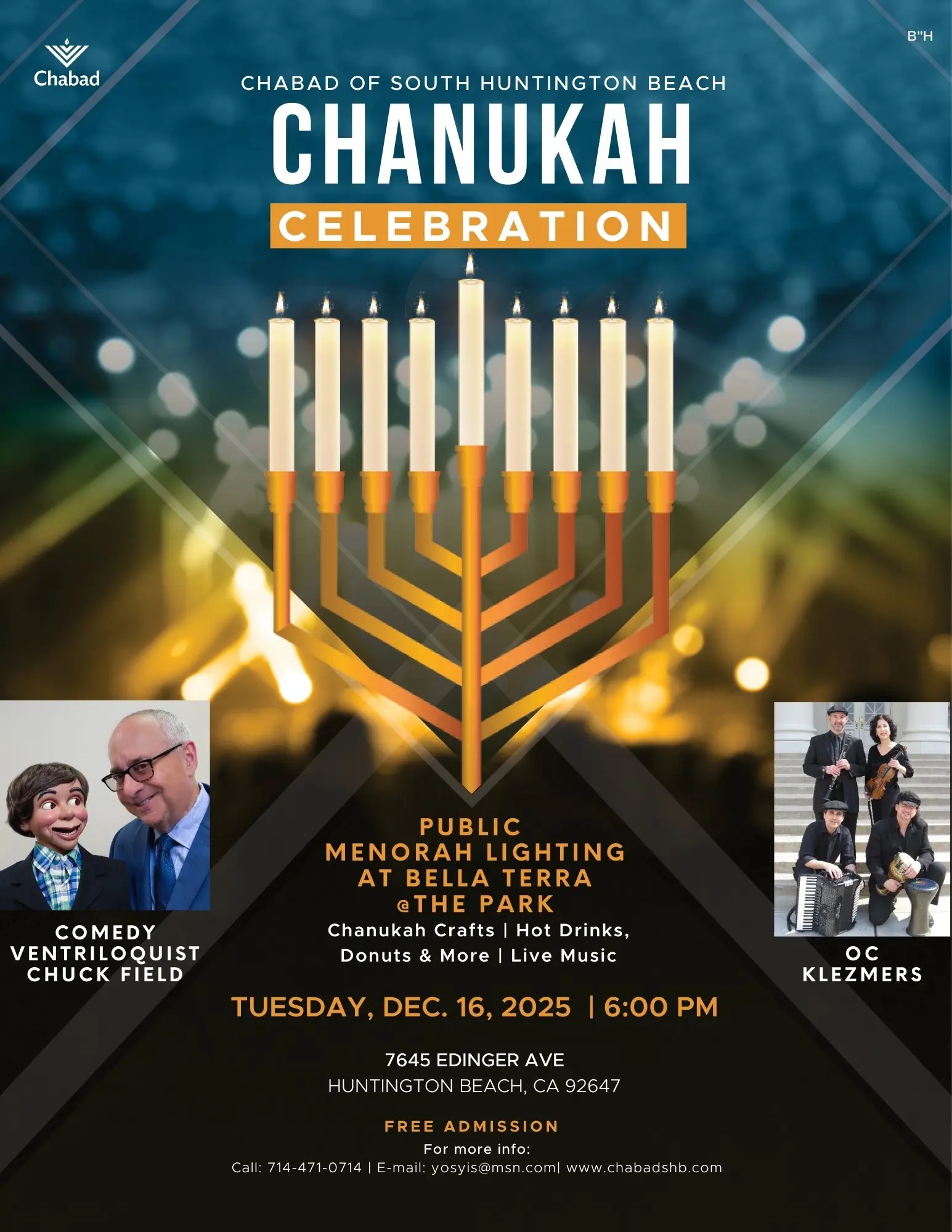 On Friday March 14, 2025 at 10 am, the Orange County Klezmers will be performing a concert of music from their popular CD “Echoes of Vilna” at the 25th Annual Holocaust Art and Writing Contest held at Chapman University's Memorial Hall. The cost of the event is free. Chabad South Huntington Beach - Bella Terra Mall Chanukah Menorah Lighting Celebration The event is FREE and OPEN to the community. Chabad Center for Jewish Life - Fashion Island, Newport Beach Chanukah Menorah Lighting Celebration The event is FREE and OPEN to the community. Cypress College's Annual Yom HaShoah Holocaust Day of Remembrance